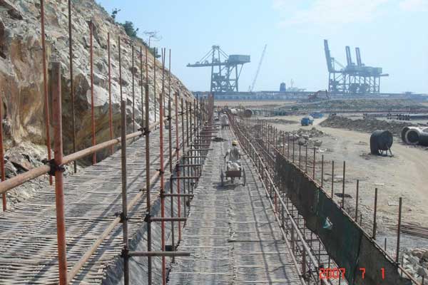 寶鋼馬跡山港工程位于泗礁本島西南1.5km處,本港至上海吳淞口約60海里,距北侖港74海里,從上海港到各大洲的國(guó)際航線均從嵊泗海域經(jīng)過。馬跡山港圍堤、陸域形成工程所需土石料由馬跡山本地就地開山采取,由寶山鋼鐵(集團(tuán))投資愈4000萬,我公司承接的寶鋼馬跡山港開山采石工程,自1996年建設(shè)以來,完成開山采石量560萬m3,爆破擠淤180萬m3,回填港區(qū)場(chǎng)地40萬㎡,山體護(hù)坡4萬m3,被評(píng)為部級(jí)優(yōu)良工程。